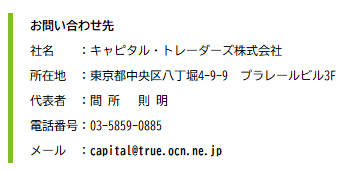 キャピタル・トレーダーズ株式会社(以下「当社」といいます。)は、お客様の個人情報に対する取組み方針として、次のとおり、プライバシーポリシーを策定し、公表いたします。